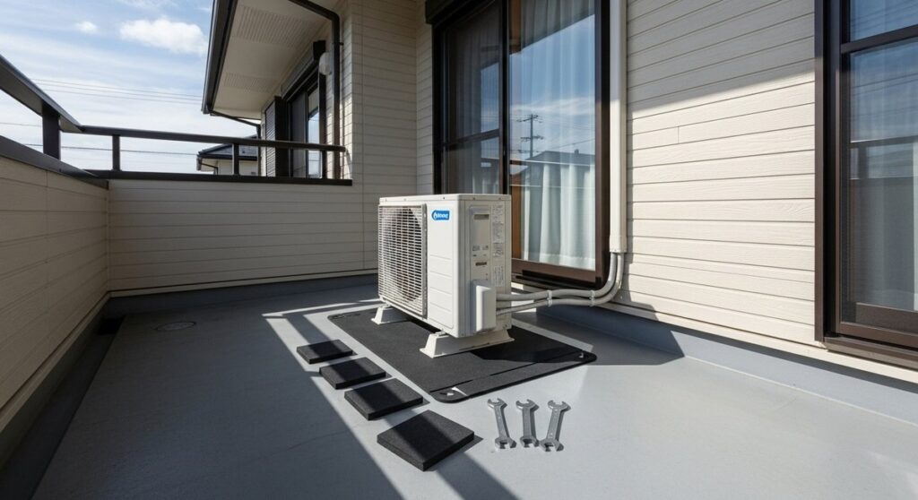 一軒家の二階のベランダに置いた室外機がうるさい!原因と防振対策