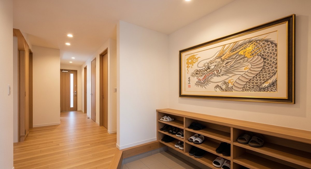 龍の絵を飾る場所には、風水における鉄則があります。それは、玄関の外から中に入った際、自分にとって「右側」の壁に飾るということです。風水では、玄関から入って右側は「青龍(せいりゅう)位」と呼ばれ、龍が最も心地よく、その力を発揮できる神聖なポジションとされています。この場所に龍の絵を配置することで、家全体の活気が高まり、特に男性の成功運や、家族全体の発展運が強化されると考えられています。