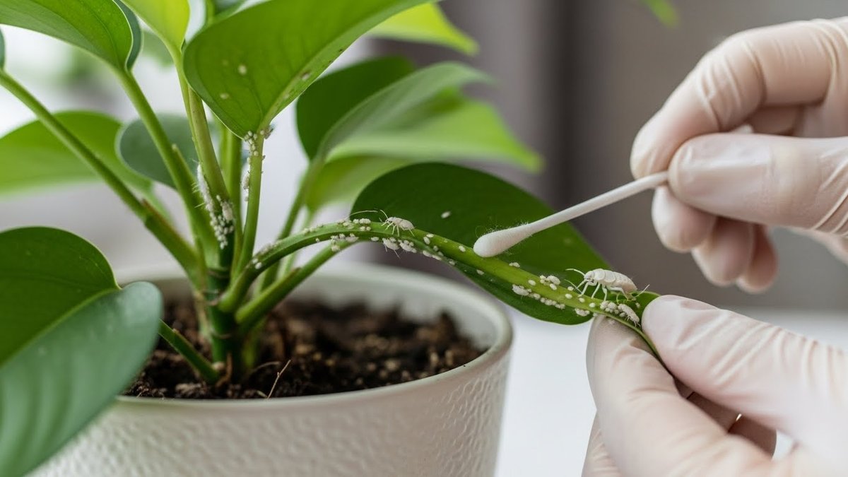 小規模な寄生なら綿棒やピンセットで一つずつ取り除くのが確実です。作業時は手袋を着け、取り除いた個体は密閉袋に入れて廃棄します。葉の裏や茎の割れ目などに隠れていることが多いので、丁寧に探して取り除きます。