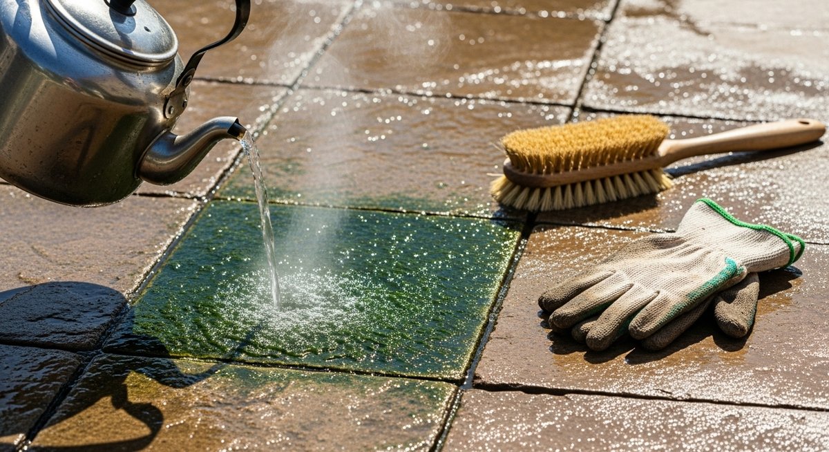 熱湯駆除が最も威力を発揮するのは、コンクリートの駐車場やタイル貼りのアプローチといった「硬い平地」です。これらの場所では熱が逃げにくく、また熱湯をかけた後にブラシでこすり落とす作業もしやすいため、非常に相性が良いです。タイルの目地に詰まったイシクラゲも、熱で浮き上がらせることで一気に除去できます。
