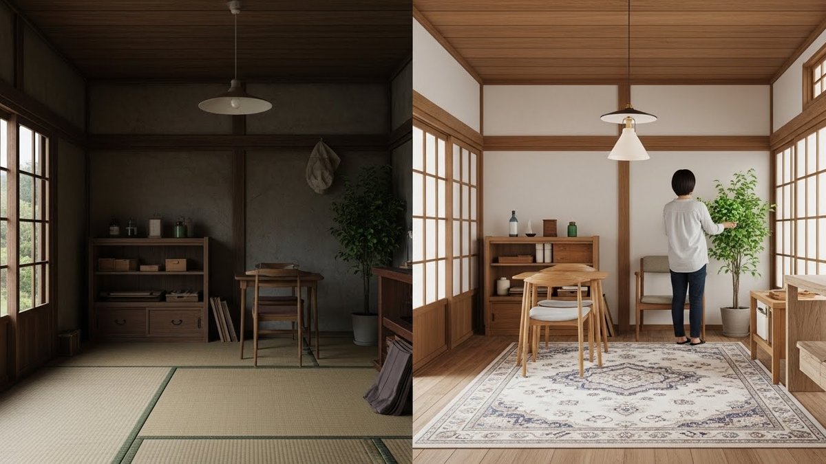 古い家の多くは、天井に張り付いたような白い蛍光灯一つで部屋を照らしています。これが陰影を平坦にし、古さを強調してしまいます。これを電球色の温かい光に変えるだけで、雰囲気は激変します。