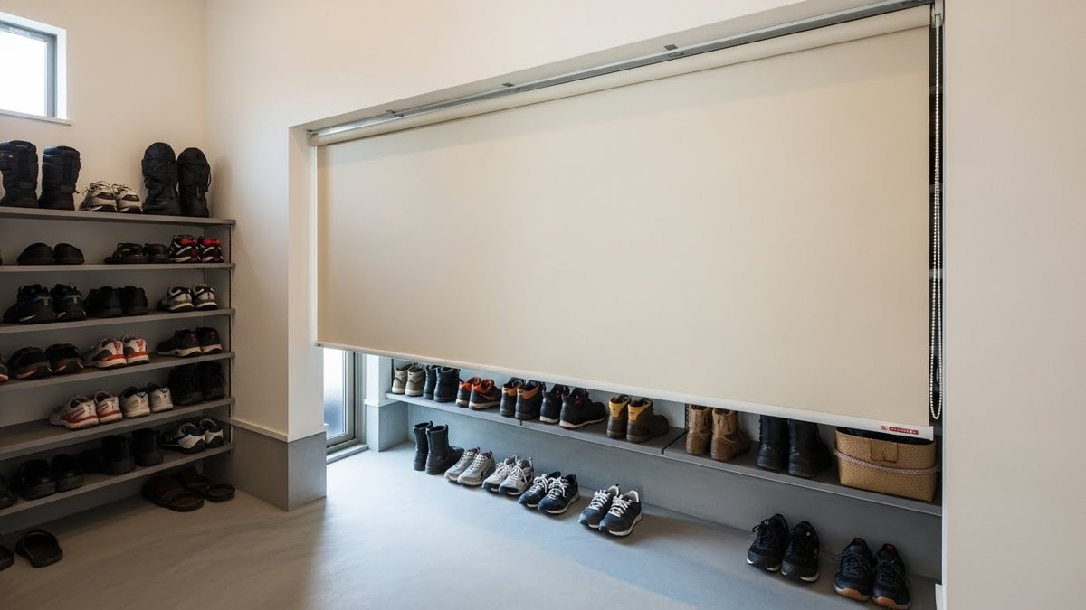 土間収納は、靴だけでなく、傘、ベビーカー、アウトドア用品、子供の遊び道具など、屋外で使用する雑多なものが集まる場所です。これらが玄関から丸見えになっていると、どうしても生活感が出てしまい、急な来客時に慌ててしまうことになります。ロールスクリーンを設置することで、必要な時だけさっと下ろして視線を遮ることができ、玄関全体をすっきりと見せることができます。