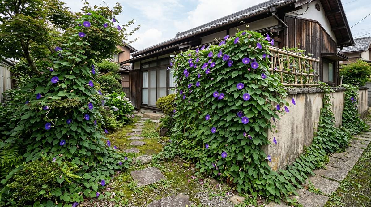 琉球朝顔の管理において最も厄介なのは、「少し目を離すと収拾がつかなくなる」という点です。忙しい日々が続き、一週間ほど手入れを忘れると、蔓は屋根に届き、雨どいを塞ぎ、窓を覆い尽くしてしまいます。こうなると、一般の人がハサミ一本で解決できるレベルを超えてしまい、高所作業車や専門業者の手が必要になることさえあります。