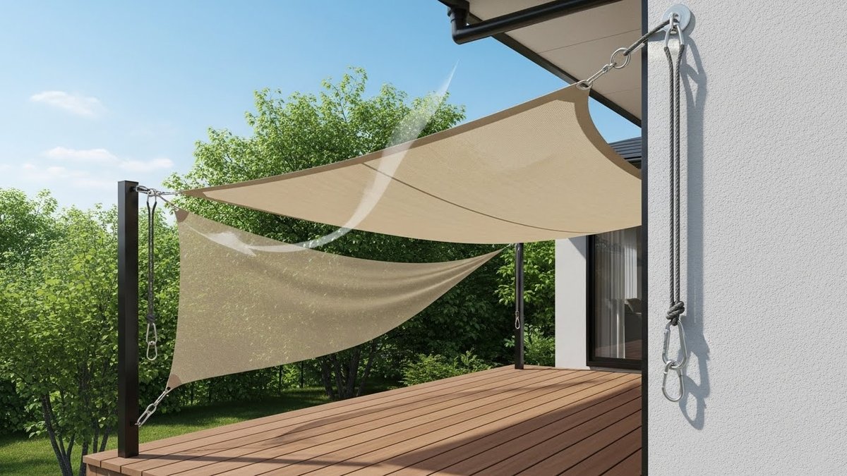 通常、シェードは四隅を固定しますが、風が強い場所では「多点固定」が有効です。例えば長方形の長い辺の中間点にもハトメがあるタイプを選び、そこからもロープを張ることで、生地のたわみを劇的に減らすことができます。固定するポイントを増やすほど、一箇所にかかる荷重が分散され、結果として金具の脱落や生地の裂けを防ぐことができます。3点支持よりも4点、可能ならそれ以上の箇所で支える工夫をしましょう。