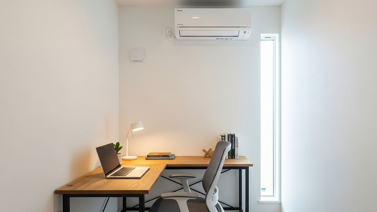 完全に壁で囲まれた個室書斎の場合、独立したエアコン設置が最も快適です。設置の条件としては、外壁に面しており室外機を置く場所があること、専用のコンセント(100V)が壁の高い位置にあることが挙げられます。これらの条件が揃っていない場合は、壁に穴を開ける工事や電気工事が必要になるため、新築やリフォームの段階で計画しておくことが理想的です。