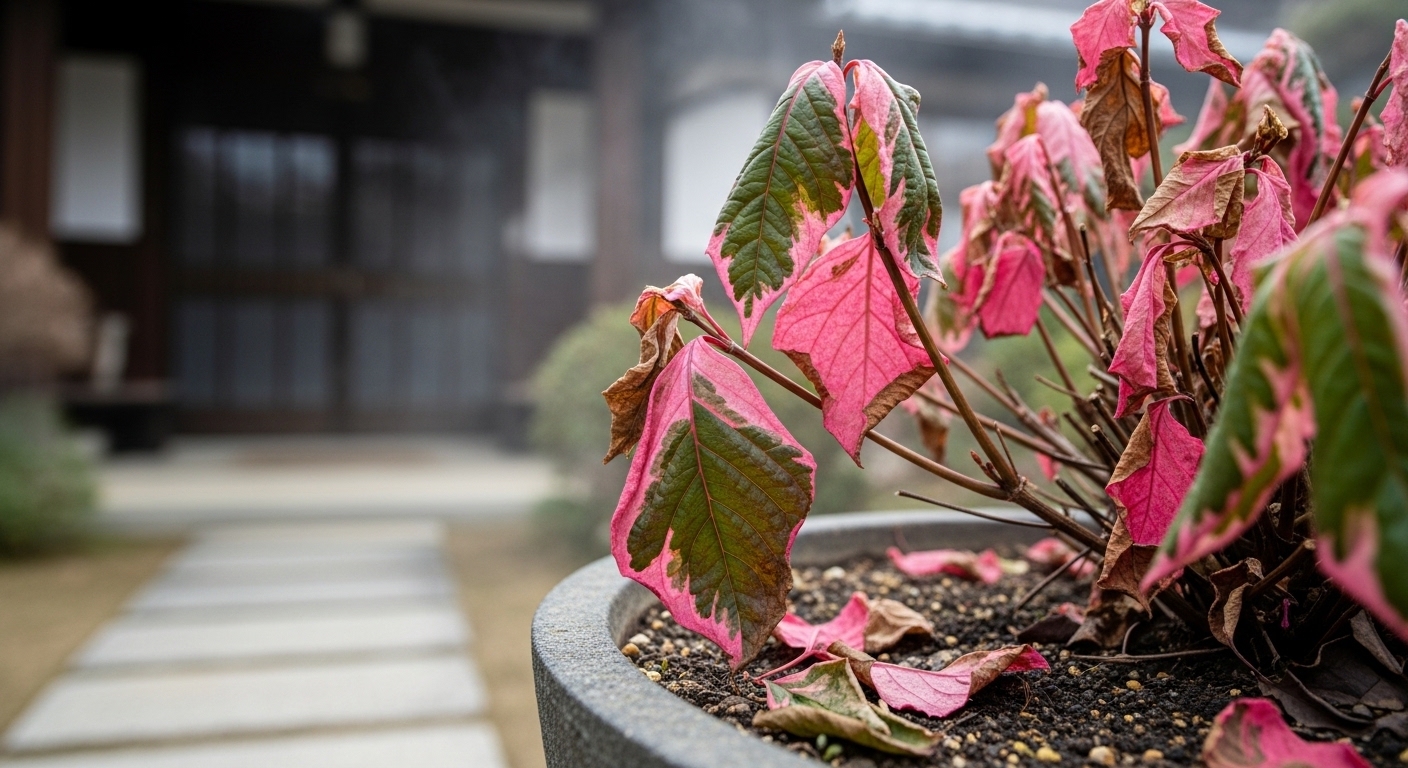 ハツユキカズラの最大の魅力は、白やピンクの斑入り葉ですが、冬になるとそれらが赤茶色や銅色に変化します。この色の変化を「枯れ」と勘違いしてしまう方が少なくありません。