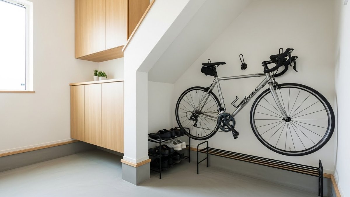 ロードバイクやクロスバイクなどの趣味の自転車を屋内で保管する場合、階段下土間は最適なガレージになります。スタンドを使って縦置きにすれば省スペースで収納でき、壁にディスプレイ用のフックを取り付ければ、メンテナンスもしやすくなります。