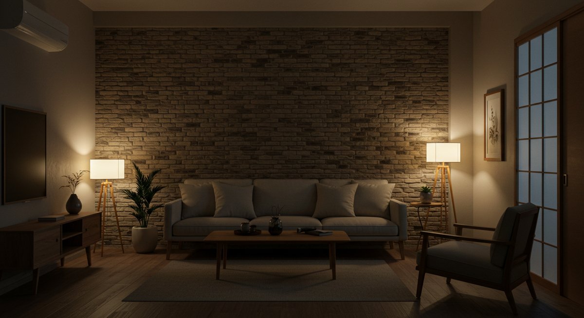 壁紙の雰囲気は、照明次第で大きく変わります。たとえば、白熱灯など暖かみのある照明を使うと、レンガ調壁紙がより温かみのある空間を演出してくれます。